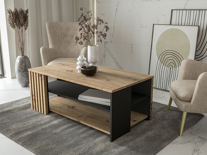 Tačan naziv dezena: konstrukcija iverica artisan hrast/crna, ploča iverica artisan hrast. Klub sto CARDIGAN predstavlja izuzetno moderno rešenje za opremanje ambijenta dnevne sobe i zadovoljiće sve dizajnerske i funkcionalne zahteve savremenih domova.