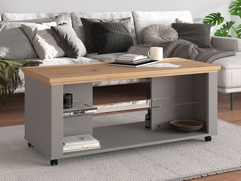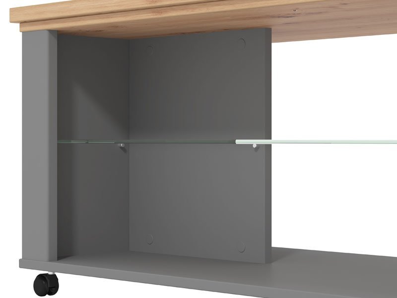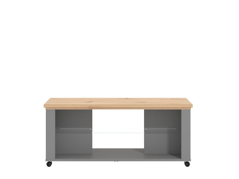 Klub sto VALENCIA KS u kombinaciji dekora artisan hrast, grafit sive i sive mat folije unosi u prostor suptilniju, monohromatsku notu. Poseduje staklenu policu ispod radne površine koja doprinosi dodatnoj eleganciji. Pripada istoimenom sistemu elemenata VALENCIA, koji odlikuje funkcionalnost i praktičnost kojoj doprinosi, kako veliki broj elemenata u sistemu, tako i odlična organizacija prostora za odlaganje.