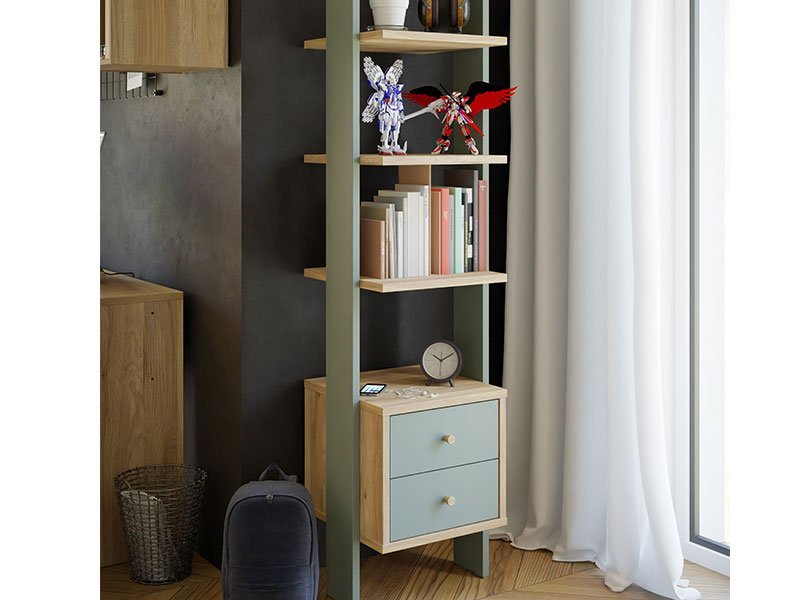 Tačan opis dezena je: korpus iverica Mauvella hrast D108, front iverica Sage U59 / Mauvella hrast D108. Polica WHENUA 190 deo je istoimene kolekcije za opremanje dnevnog boravka a upotrebni prostor čine četiri otvorene police i dve praktične fioke.