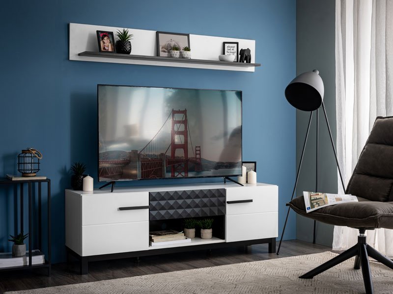 Zidna polica SARTHE ZP je sjajan funkcionalni dodatak za uređenje ambijenta dnevnog boravka. Kombinacija crnog dekora i bele lak folije unose osvežavajuću estetiku u ambijent.