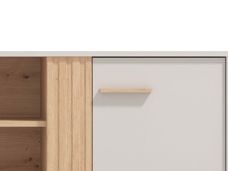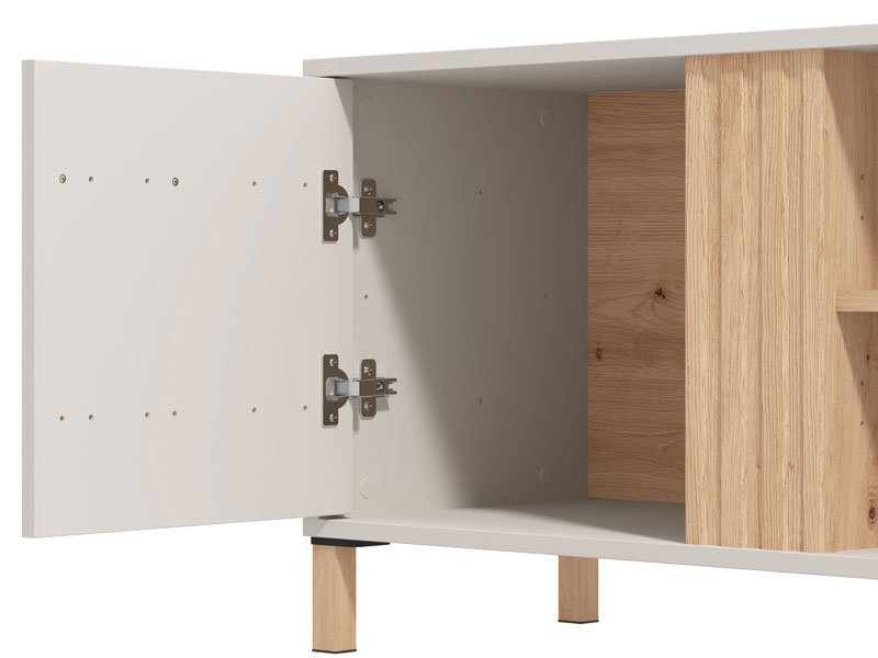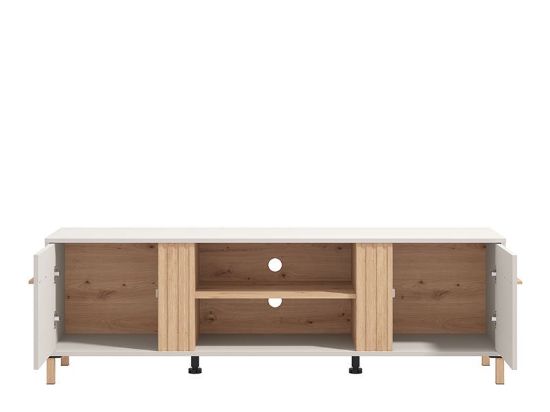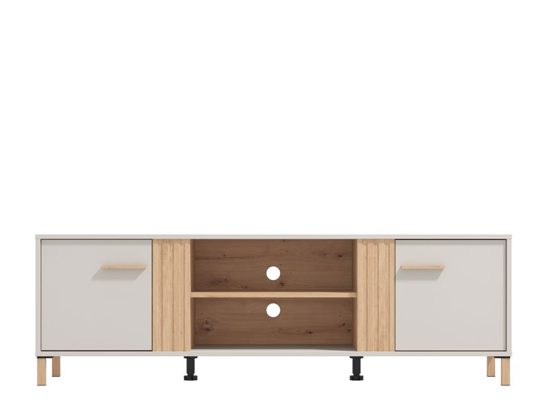 TV polica BELFORT 3K2V je funkcionalni dodatak za opremanje dnevnog boravka. Kombinacija dekora kašmira i artisan hrast folije donosi u prostor notu elegancije i ambijentalne topline i sa sofisticiranim stilskim izrazom koji je potreban savremenim enterijerima. Dva bočna zatvorena segmenta i otvorene police, efektno doprinose funkcionalnoj organizaciji dnevnog boravka. Deo je istoimenog sistema elemenata za uređenje ambijenta dnevnog boravka, koji predstavlja moderno rešenje za stilizovanje ambijenta doma. Postoji mogućnost dodavanja rasvete. *Napomena: cena je bez led rasvete. Preporučujemo Set spot svetla 1 SVETILJKA, Set spot svetla 2 SVETILJKE