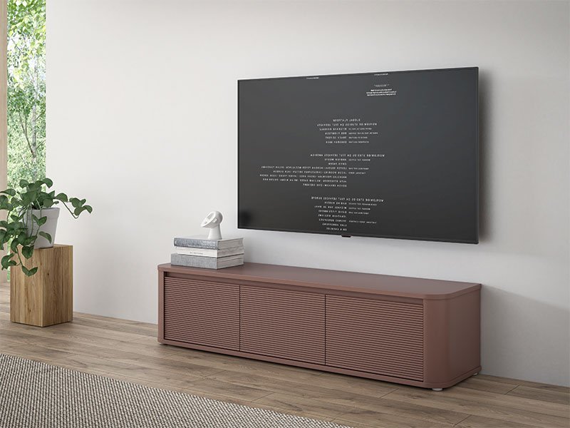Tačan naziv dezena je: konstrukcija iverica Terracota, front mdf Terracota. TV polica BREATHTAKER predstavlja izuzetno moderno rešenje za opremanje ambijenta dnevnog boravka. Upotrebni prostor se sastoji od tri zatvorena pregradna dela. Zaobljene ivice značajno doprinose estetici ovog komada nameštaja i ističu ga u prostoru.