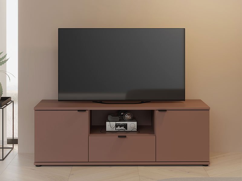 Tačan naziv dezena: konstrukcija / front iverica terracota. TV polica GANYMEDE 130 je funkcionalni dodatak za opremanje dnevnog boravka. Kombinacija dekora unosi svežinu i koloritnu ujednačenost u ambijent. Deo je istoimenog sistema elemenata za uređenje ambijenta dnevnog boravka.