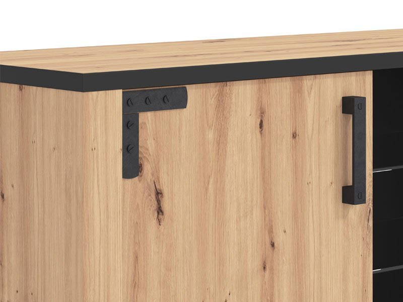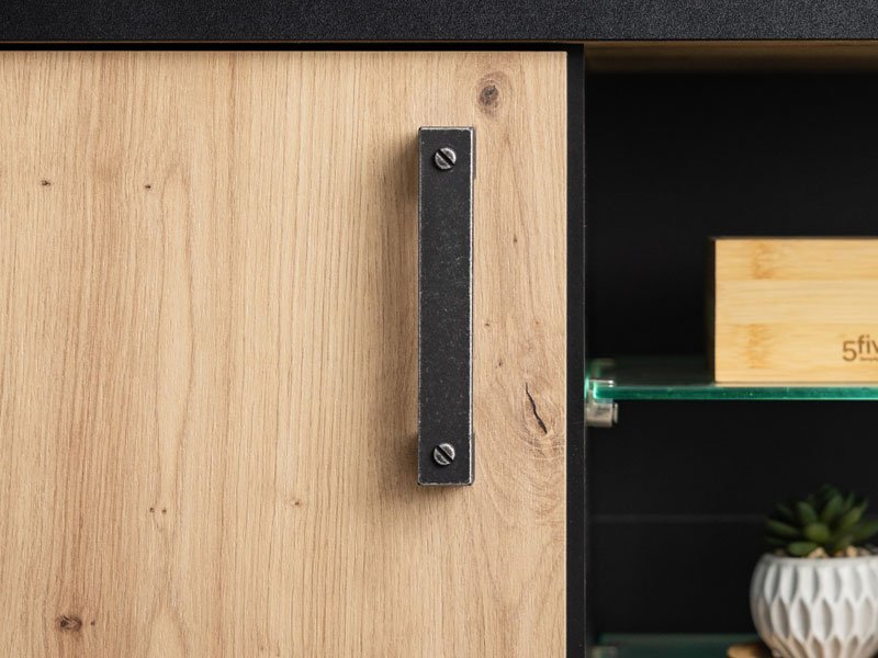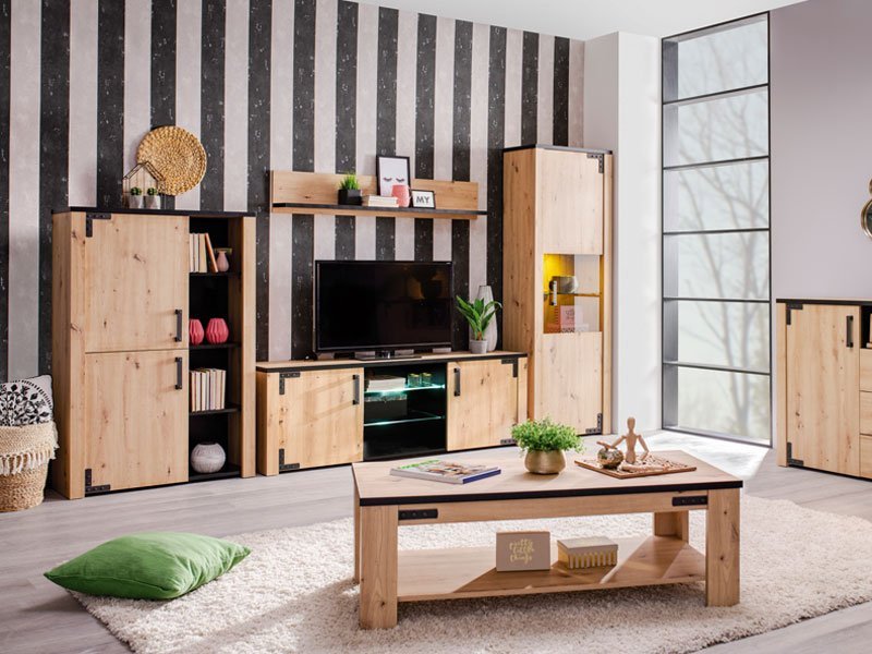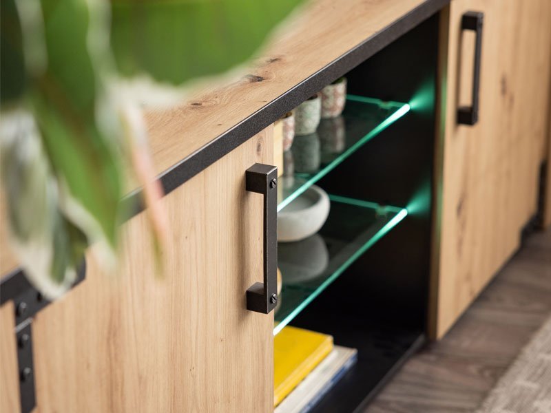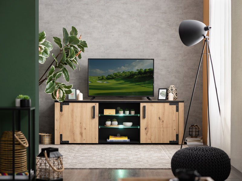 TV polica LAZIO TV 170 predstavlja kombinaciju artisan hrasta, crnog dekora i detalja u vidu metalnih okova na frontovima. Svojom estetskom formom i praktičnim dizajnom sa dva zatvorena bočna segmenta i otvorenim delom sa dve staklene police, efektno doprinosi kvalitetnoj organizaciji dnevnog boravka. Pripada istoimenoj kolekciji LAZIO, sa čijim elementima zaokružuje čitavu enterijersku celinu i predstavlja autentičan izraz kombinacije industrijskog stila i topline dekora drveta. Postoji mogućnost ugradnje dodatne rasvete.