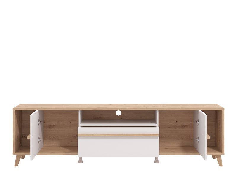 TV polica ORLEANS je sjajan funkcionalni dodatak za uređenje ambijenta dnevnog boravka. Kombinacija opak belog dekora, artisan hrasta i artisan hrast folije, unose osvežavajuću estetiku u ambijent. Dva zatvorena segmenta, praktična fioka, kao i otvoreni segmenti, efektno doprinose funkcionalnoj organizaciji TV kutka. Postoji mogućnost dodavanja rasvete . *Napomena: cena je bez led rasvete. Preporučujemo Set spot svetla 2 SVETILJKE
