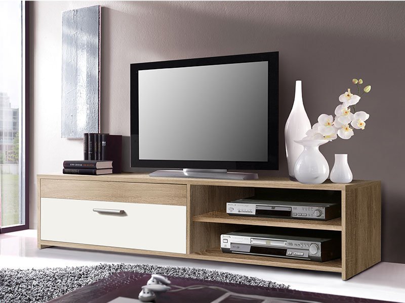 TV polica PACO, u kombinaciji belog i sonoma dezena sa kombinacijom otvorenog pregradnog dela i zatvorenog segmenta, prati praktične enterijerske inovacije koje će se idealno integrisati u ambijent vašeg dnevnog boravka.