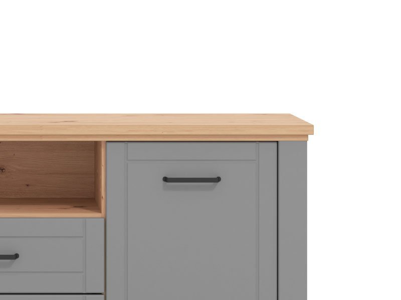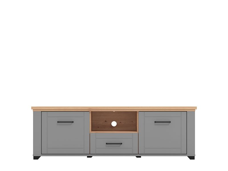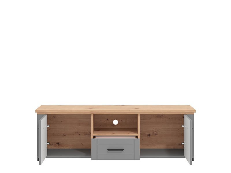 TV polica VALENCIA TV 160 3K1F u kombinaciji dekora artisan hrast, grafit sive i sive mat folije unosi u prostor suptilniju, monohromatsku notu. Upotrebni prostor čine praktična fioka u središnjem delu, jedan otvoreni i dva zatvorena dela, koji poseduju praktično raspoređene police za odlaganje. Frontovi su obogaćeni crnim ručicama jednostavnog dizajna, a koje su usklađene sa dizajnerskom linijom cele kolekcije. Pripada istoimenom sistemu elemenata VALENCIA, koji odlikuje funkcionalnost i praktičnost kojoj doprinosi, kako veliki broj elemenata u sistemu, tako i odlična organizacija prostora za odlaganje.