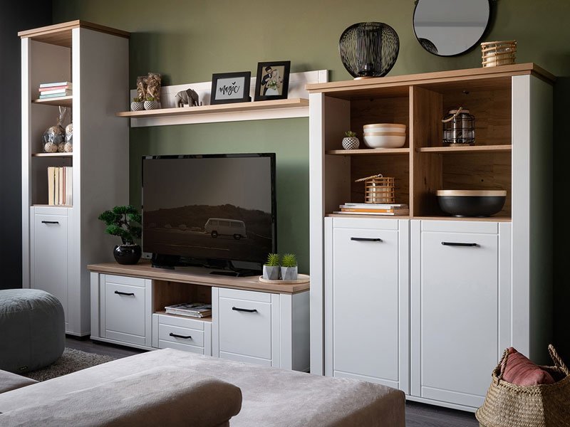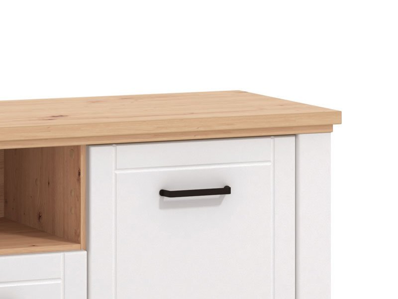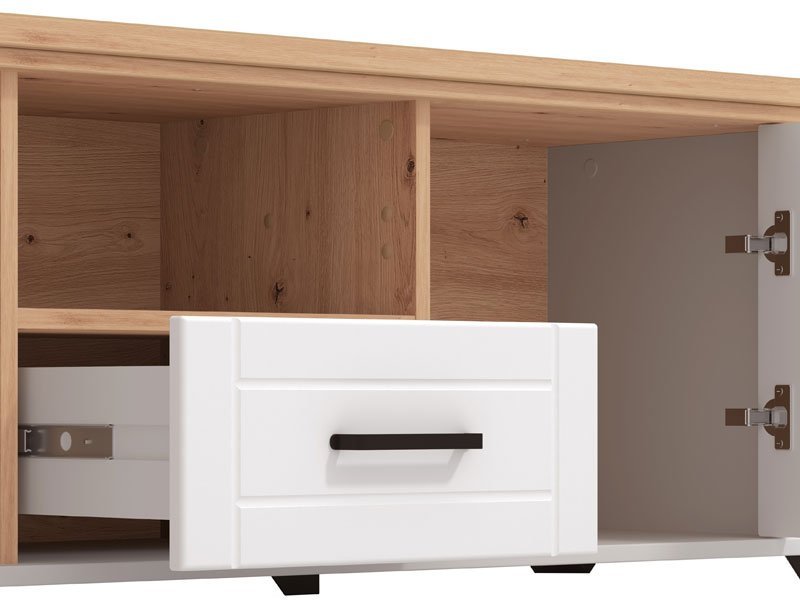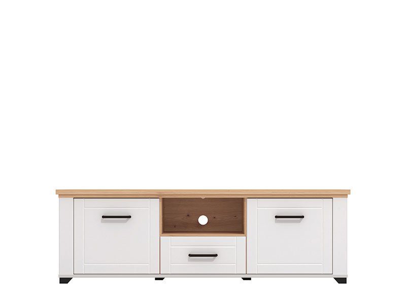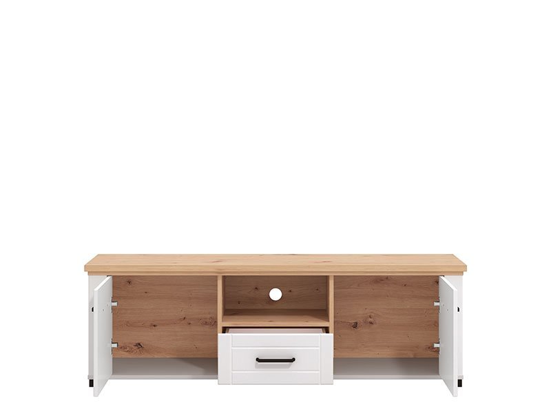 TV polica VALENCIA TV 160 3K1F u kombinaciji dekora artisan hrasta, opak bele i bele mat folije, je dizajnerski privlačno rešenje za uređenje dnevnog boravka, koje daje topliju estetiku enterijeru. Upotrebni prostor čine praktična fioka u središnjem delu, jedan otvoreni i dva zatvorena dela, koji poseduju praktično raspoređene police za odlaganje. Frontovi su obogaćeni crnim ručicama jednostavnog dizajna, a koje su usklađene sa dizajnerskom linijom cele kolekcije. Pripada istoimenom sistemu elemenata VALENCIA, koji odlikuje funkcionalnost i praktičnost kojoj doprinosi, kako veliki broj elemenata u sistemu, tako i odlična organizacija prostora za odlaganje.