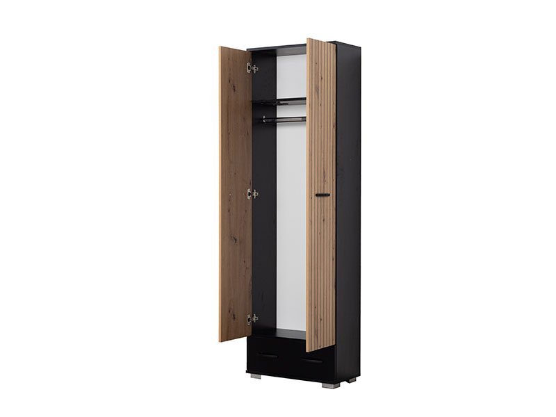 Tačan naziv dezena: korpus iverica atlantic hrast, front iverica atlantic hrast. Dvokrilni ormar KING 2V1F sa garderobnom šipkom, fiokom i jednom policom omogućava fukncionalno odlaganje odeće. Racionalna organizacija prostora i klasičan mehanizam ormara KING 2V1F čini ovaj model fleksibilnim za uklapanje u različite tipove ambijenata.