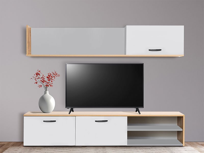 Tačan naziv dezena: korpus iverica artisan, front iverica bela sjaj. Regal BONGO, dizajniran je da zadovolji funkcionalne i estetske zahteve u uređenju ambijenta dnevnog boravka. Regal BONGO omogućava praktično opremanje dnevnog boravka, zahvaljujući upotrebnom prostoru koji čine kako otvorene, tako i zatvorene police za odlaganje, kao i prostor predviđen za TV uređaj i ostalu audio-vizuelnu opremu. Prostor za TV deo je : 180×40 cm.