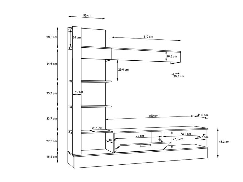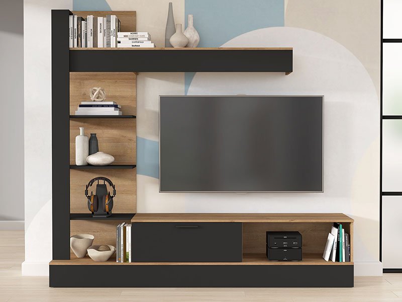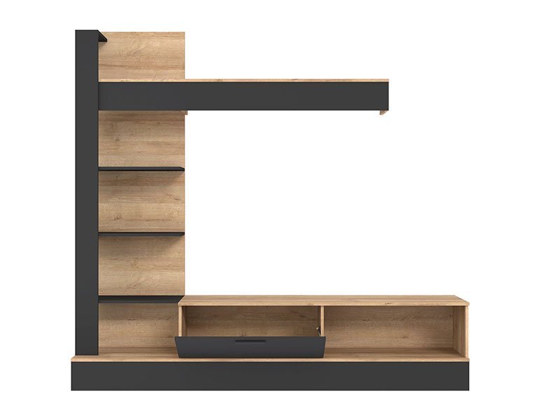 Tačan naziv dezena je: GLZM02L-M818, korpus iverica riviera hrast, front iverica crna . Regal GELUZA dizajniran je da zadovolji funkcionalne i estetske zahteve u uređenju svakog ambijenta. Omogućava kompletno opremanje dnevnog boravka, zahvaljujući izuzetno praktičnom rasporedu otvorenih i zatvorenih polica.Prostor za TV je : 149x41x98cm .