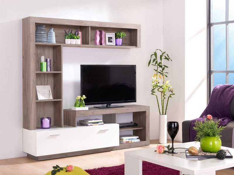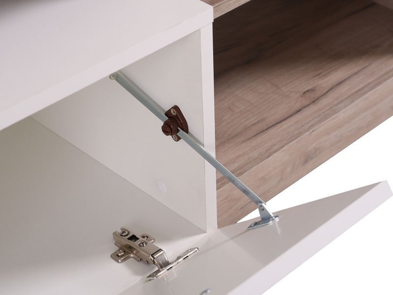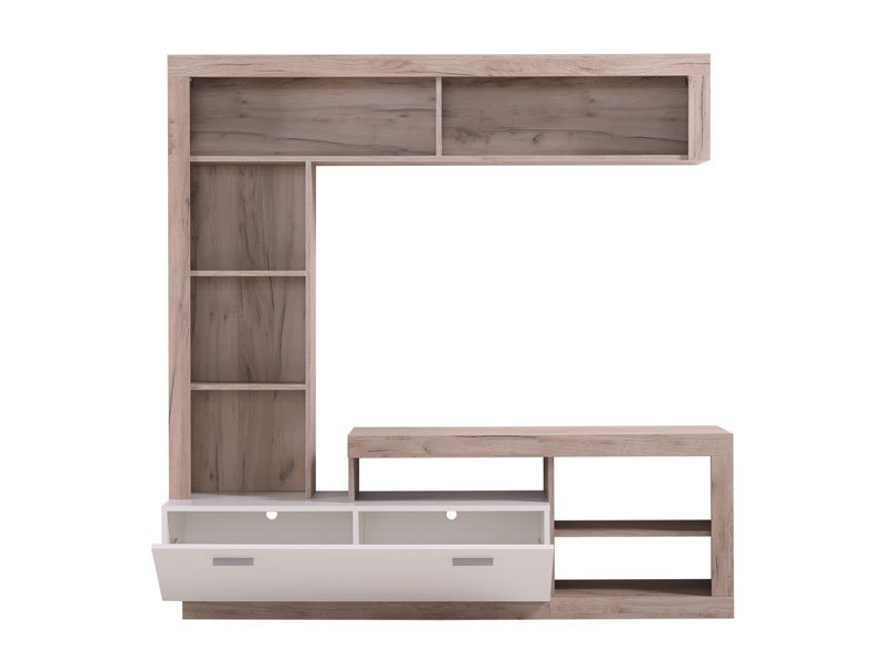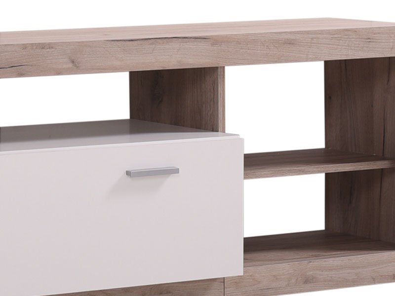 Regal GLEN, u kombinaciji sivog hrast i opak belog dezena, prati usaglašenost forme i funkcije, kao i upečatljiv dizajn namenjen modernom osveženju dnevnog boravka. Zatvoreni deo, centralno pozicionirana TV polica i otvoreni segmenti formiraju kompaktnu celinu za čuvanje svih vaših dragih sitnica i audio-vizuelnih uređaja. Prostor za TV je 115,4×82,5cm (do 55”).