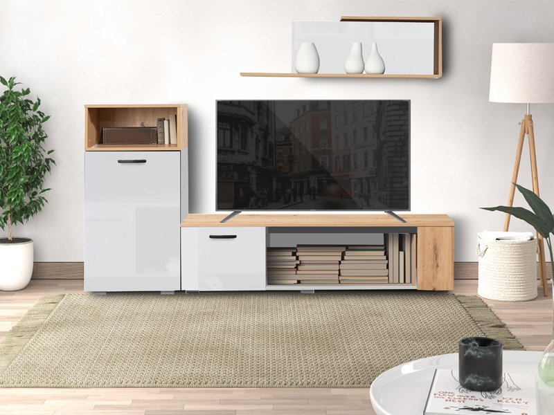 Tačan naziv dezena: korpus iverica artisan, front iverica bela sjaj. Regal KING odlikuje upečatljiv dizajn namenjen modernom osveženju dnevnog boravka. Otvoreni segmenti formiraju kompaktnu celinu za čuvanje svih vaših dragih sitnica i audio-vizuelne uređaje. Prostor za TV je : 200x40x100 cm.