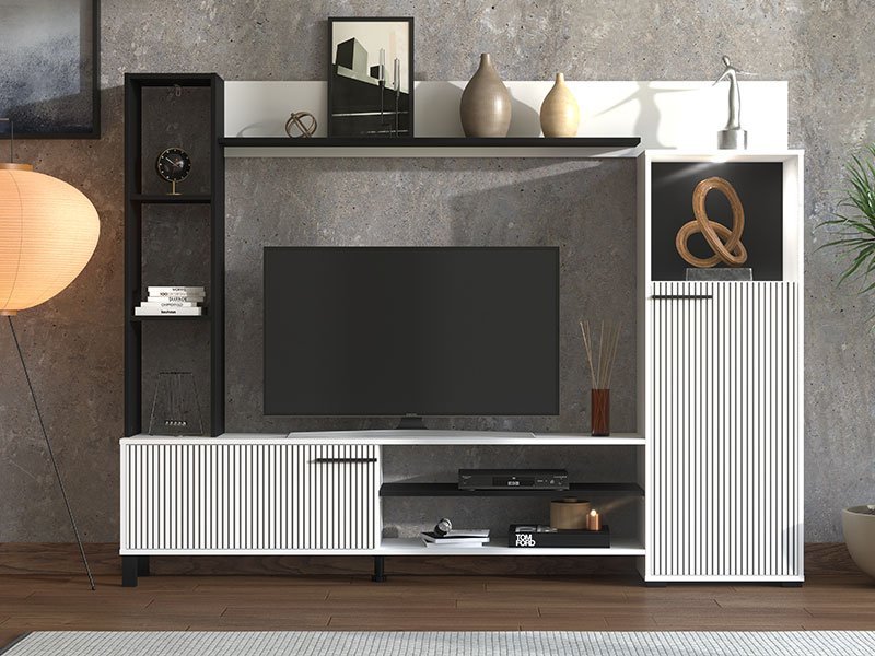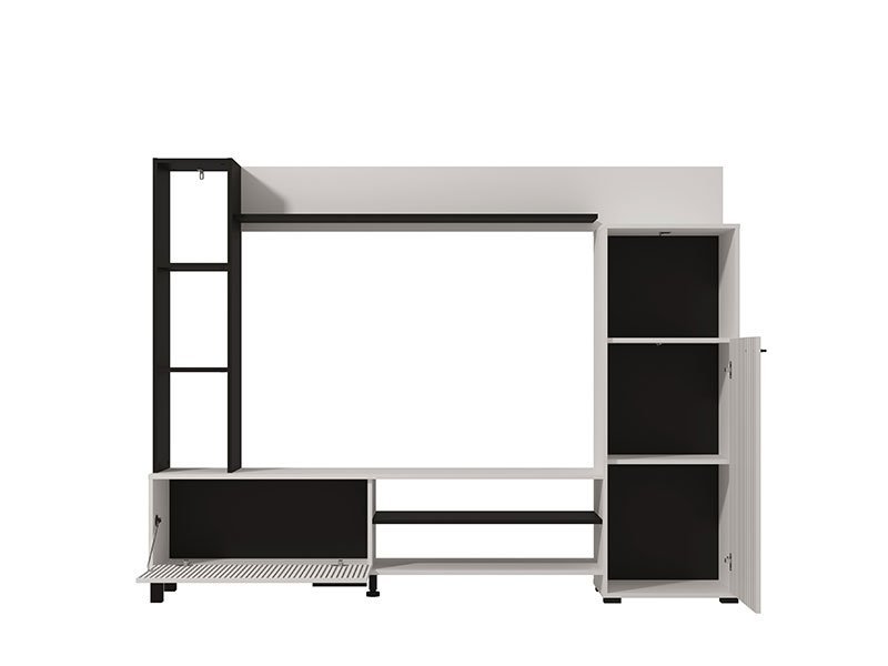 Regal RETIMNO, u kombinaciji dekora bele sa crnim prugama, kao i crnog dekora, dizajniran je da zadovolji funkcionalne i estetske zahteve u uređenju svakog ambijenta. Kompaktnog dizajna, regal RETIMNO omogućava praktično opremanje dnevnog boravka, zahvaljujući upotrebnom prostoru koji čine otvorene i zatvorene police za odlaganje, kao i prostor predviđen za TV uređaj 130x33x112 cm (do 58”) i ostalu audio-vizuelnu opremu. Postoji mogućnost dodavanja rasvete. *Napomena: cena je bez led rasvete.