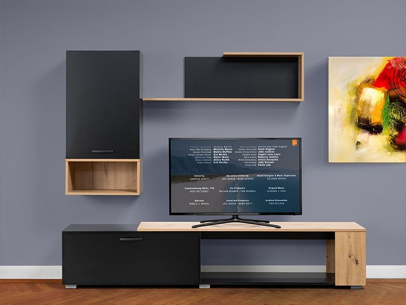 Tačan naziv dezena : korpus iverica crna, front iverica artisan. Regal RING odlikuje upečatljiv dizajn namenjen modernom osveženju dnevnog boravka. Otvoreni segmenti formiraju kompaktnu celinu za čuvanje svih vaših dragih sitnica i audio-vizuelne uređaje. Prostor za TV deo je: 200x40x80 cm.