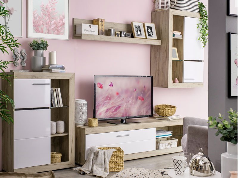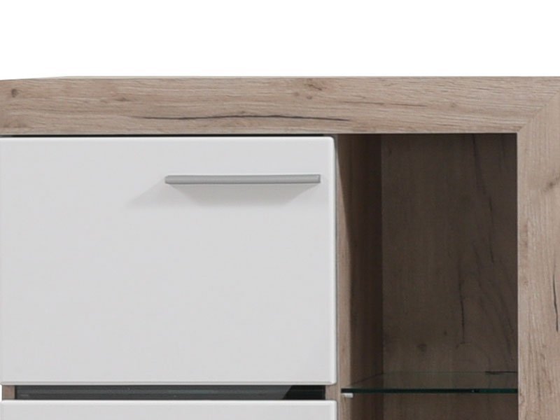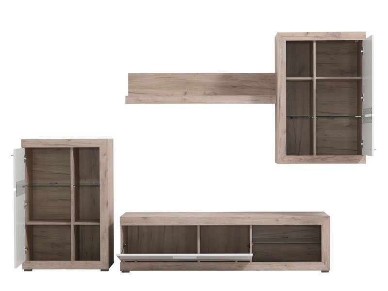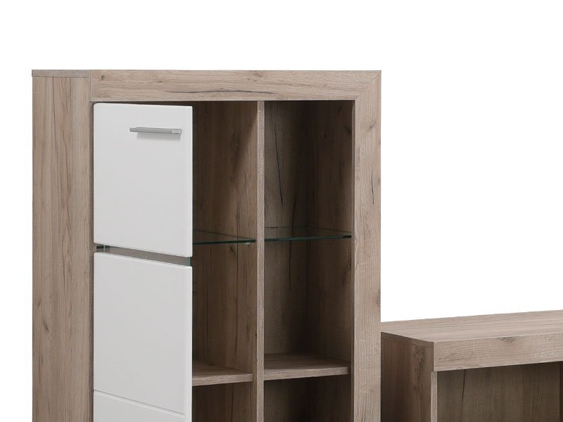 Regal ROSSO, u dekoru sivog hrasta sa frontovima presvučenim belom 3D MDF lak folijom, dizajniran je da zadovolji funkcionalne i estetske zahteve u uređenju svakog  ambijenta. Regal ROSSO omogućava kompletno opremanje dnevnog boravka, zahvaljujući izuzetno praktičnom rasporedu otvorenih i zatvorenih polica. Postoji mogućnost dodavanja LED rasvete. Prostor za TV je 120x90cm (do 60”). *Napomena: Cena bez rasvete – Mogućnost dodavanja rasvete. Preporučujemo Set LED rasvete RA-5