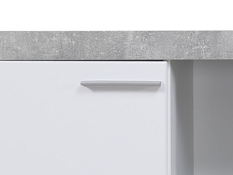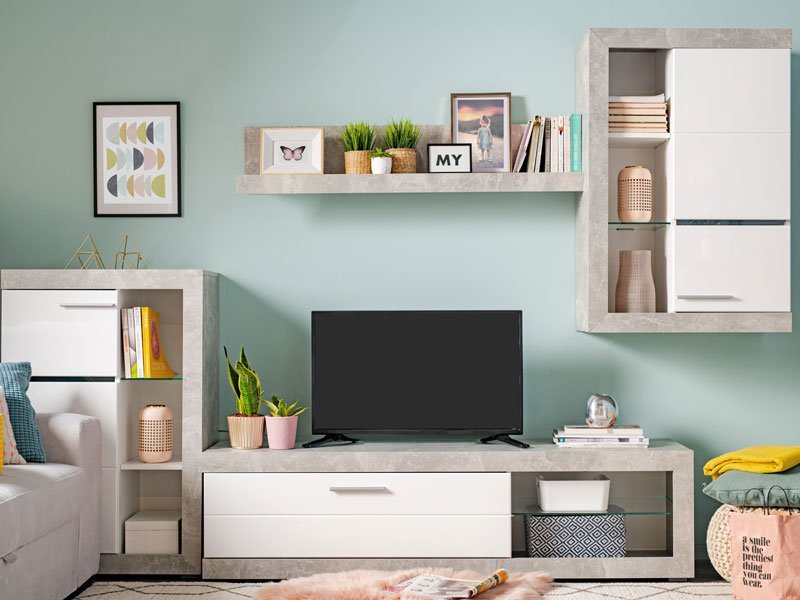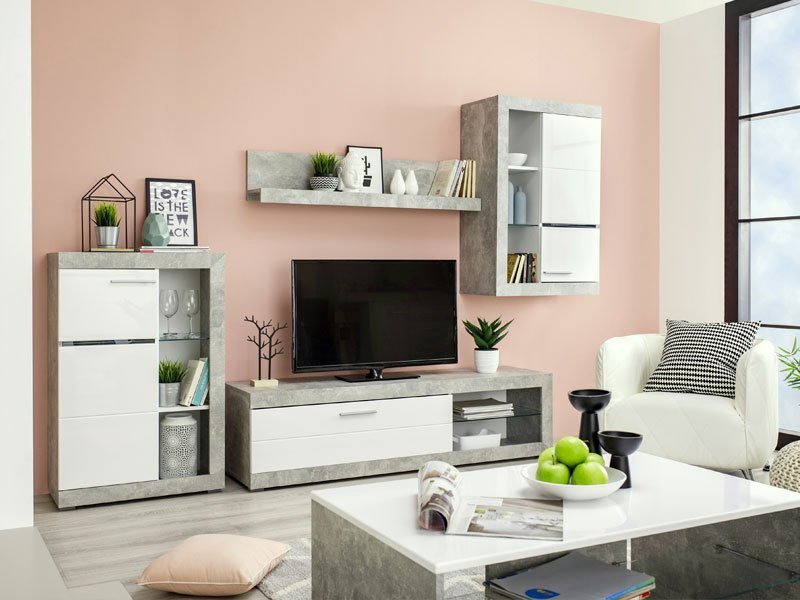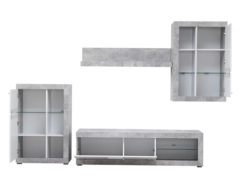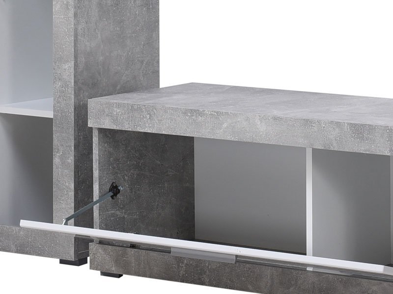 Regal ROSSO, u kombinaciji beton dekora i opak bele, sa frontovima presvučenim belom 3D MDF lak folijom, dizajniran je da zadovolji funkcionalne i estetske zahteve u uređenju svakog ambijenta. Regal ROSSO omogućava kompletno opremanje dnevnog boravka, zahvaljujući izuzetno praktičnom rasporedu otvorenih i zatvorenih polica. Postoji mogućnost dodavanja LED rasvete. Prostor za TV je 120x90cm (do 60”). *Napomena: Cena bez rasvete – Mogućnost dodavanja rasvete. Preporučujemo Set LED rasvete RA-5