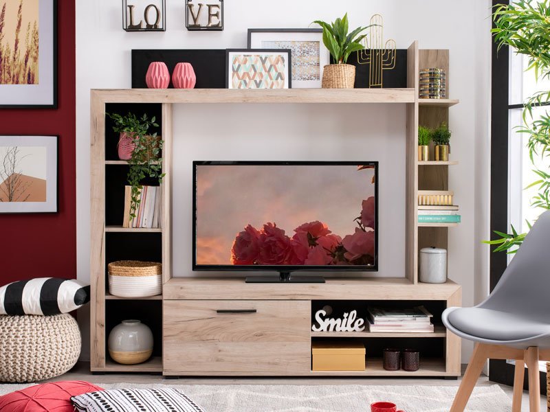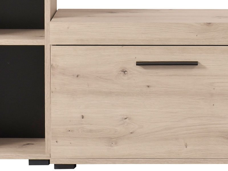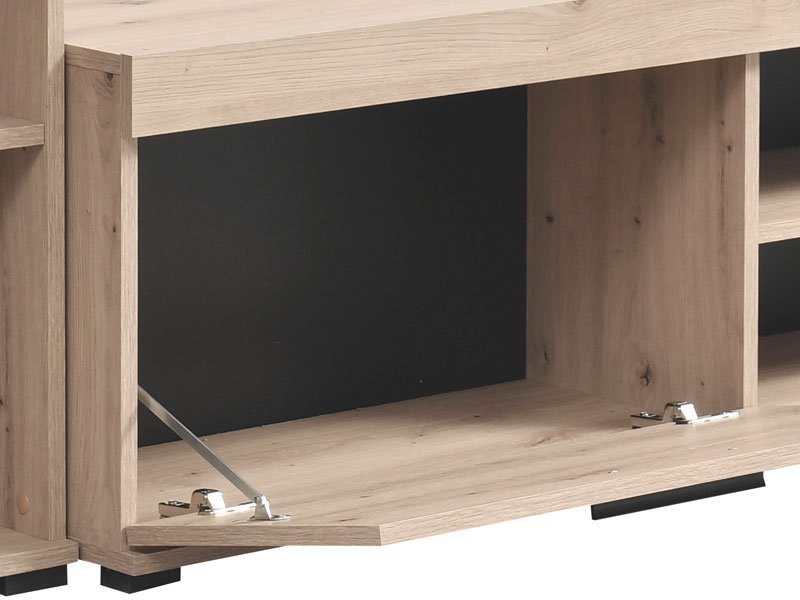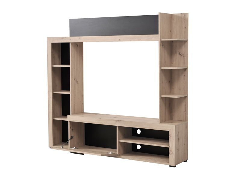 Regal RUBI u kombinaciji sivog hrasta i crnog dekora, predstavlja kompaktan model regala za funkcionalno i estetsko uređenje dnevnog boravka. Sastoji se od asimetričnih otvorenih polica različitih dimenzija i jedne zatvorene police, sa stabilnim delom za pozicioniranje TV uređaja. Prostor za TV je 116,5x84cm (do 55”).