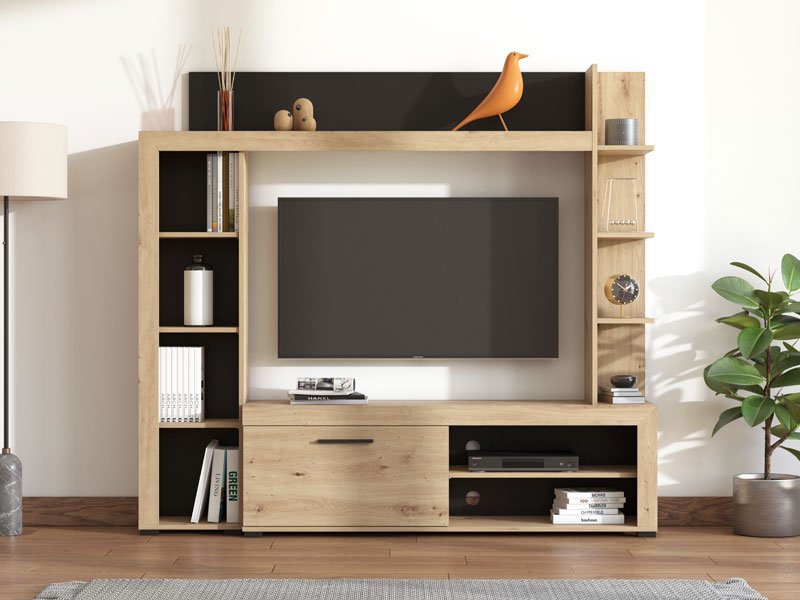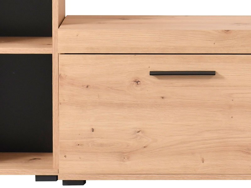 Regal RUBI u kombinaciji artisan hrasta i crnog dekora, predstavlja kompaktan model regala za funkcionalno i estetsko uređenje dnevnog boravka. Sastoji se od asimetričnih otvorenih polica različitih dimenzija i jedne zatvorene police, sa stabilnim delom za pozicioniranje TV uređaja. Prostor za TV je 116,5x84cm (do 55”).