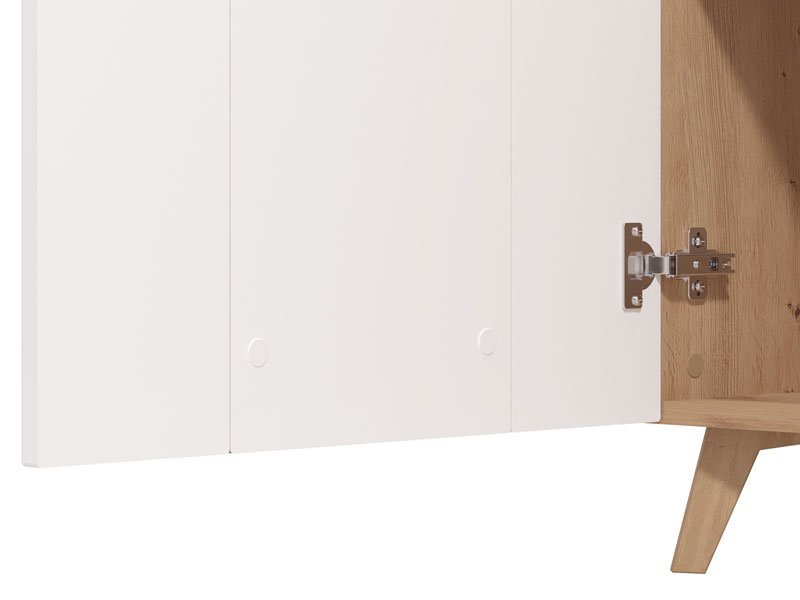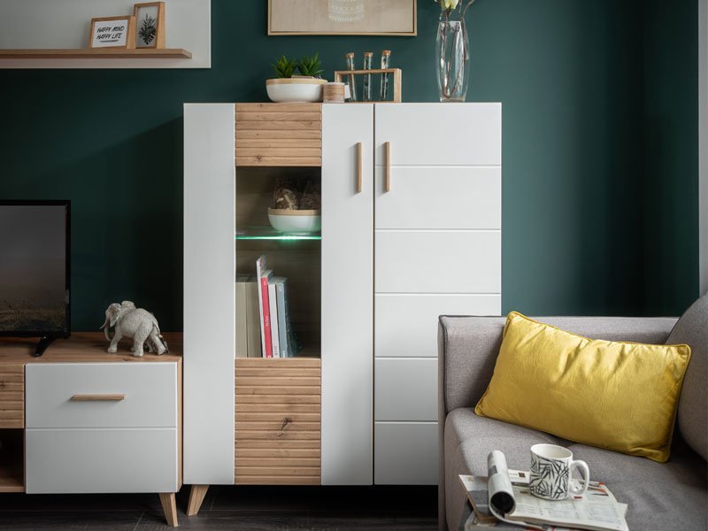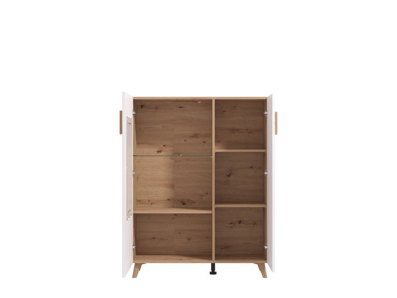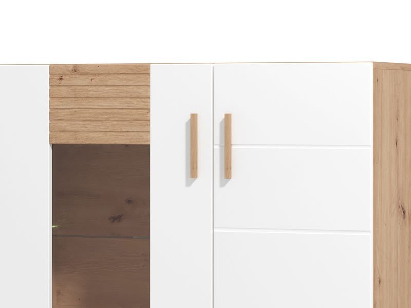 Vitrina BRETAGNA 2K VS1 izrađena je u kombinaciji dekora artisan hrasta sa segmentima u dekoru bele lak folije, kao i artisan hrast folije, koji unose osvežavajuću estetiku u ambijent. Drvene ručice povezuju dekore u jednu estetsku celinu, dok visoki nogari ističu njihovu eleganciju. Upotrebni prostor, pregradnog tipa, raspoređen je u zatvoren i zastakljen segment, što doprinosi i funkcionalnosti pored estetike. Postoji mogućnost dodavanja rasvete. Deo je istoimenog sistema elemenata za uređenje ambijenta dnevnog boravka, koje odlikuju karakteristike modernog dizajna ujedinjene sa prefinjenom notom elegancije. *Napomena: Cena bez rasvete – Mogućnost dodavanja rasvete. Preporučujemo Set LED rasvete Ra2