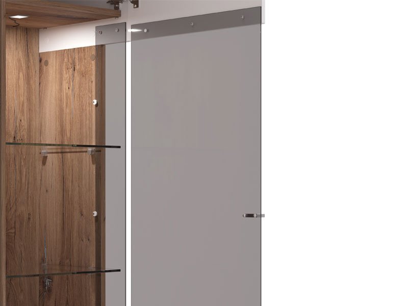 Vitrinu BURGUNDY 2K VS1 200 u kombinaciji toplog dekora flagstaf hrasta i bele lak folije. Predstavlja novi nivo estetske odvažnosti koja odlikuje najsavremenije domove, dok metalne ručice unose dodatnu ozbiljnost u dizajn ovog sistema elemenata. Odličan je izbor za opremanje dnevnog boravka. Odlikuje je funkcionalno raspoređen prostor za odlaganje, pregradnog tipa, sa jednim zatvorenim i jednom zastakljenim krilom. Iza zastakljenog dela nalaze se staklene police, koje doprinpose estetici. Postoji mogućnost dodavanja rasvete, a zatvoreni pregradni delovi odlikuju se „soft close“ sistemom zatvaranja.