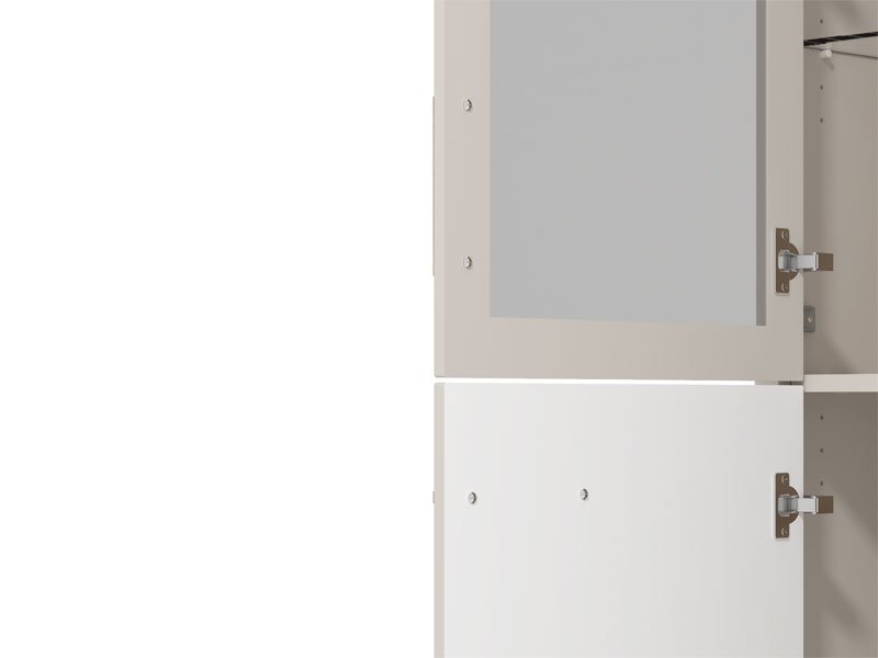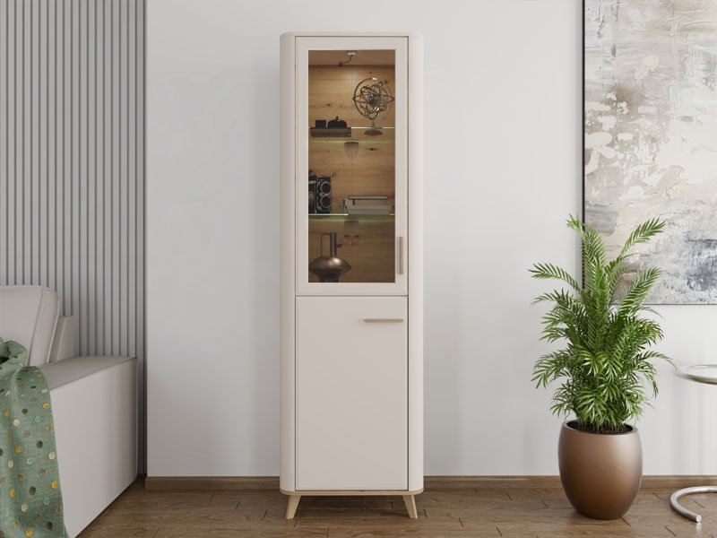 Vitrina DARWEN 1K VS1 194 u kombinaciji kašmir dekora, dekora artisan hrasta i kašmir mat folije predstavlja atraktivno rešenje za sve ljubitelje modernog dizajna enterijera. Idealan je izbor za uređenje dnevnog boravka. Upotrebni prostor čine jedan zastakljeni i jedan zatvoreni deo, sa praktično raspoređenim policama za odlaganje. Deo je sistema elemenata DARWEN za opremanje dnevne sobe koji ispunjava svakodnevne životne i ambijentalne potrebe. Vitrina DARWEN 1K VS1 194 poseduje mogućnost dodavanja rasvete, što je izuzetan način da se istakne njena estetika, a životni prostor učini još atraktivnijim. *Napomena: cena je bez led rasvete. Preporučujemo Set LED rasvete Ra2, Set spot svetla 1 SVETILJKA