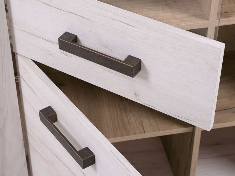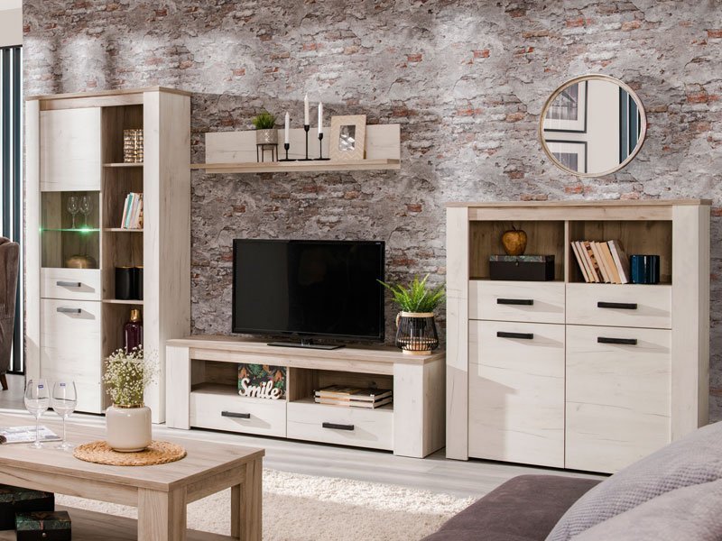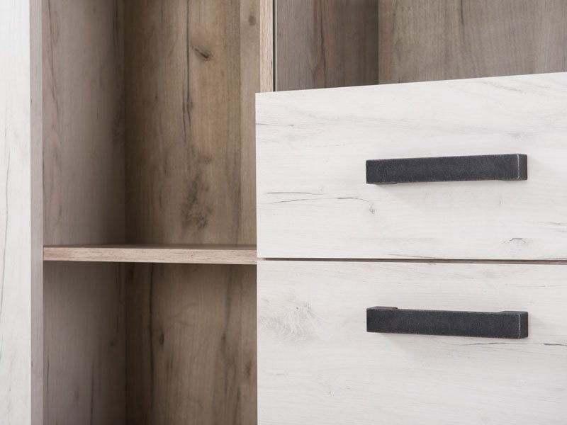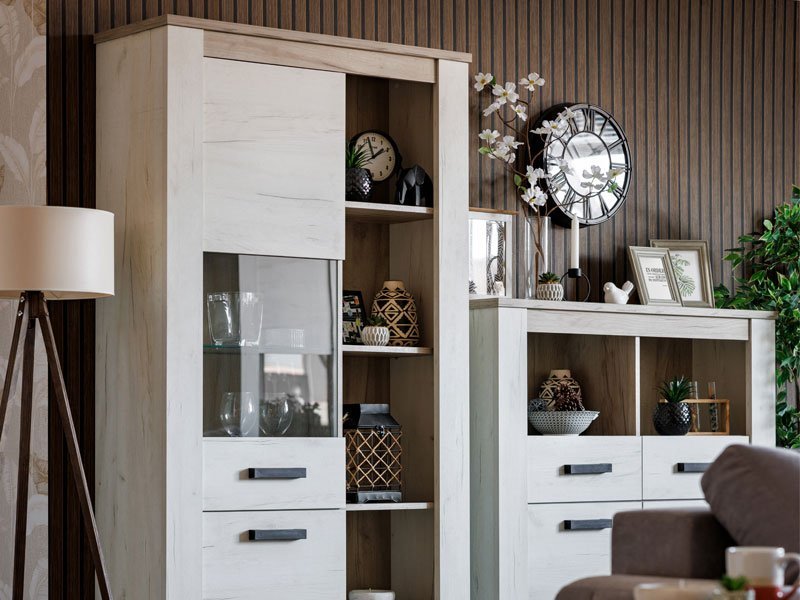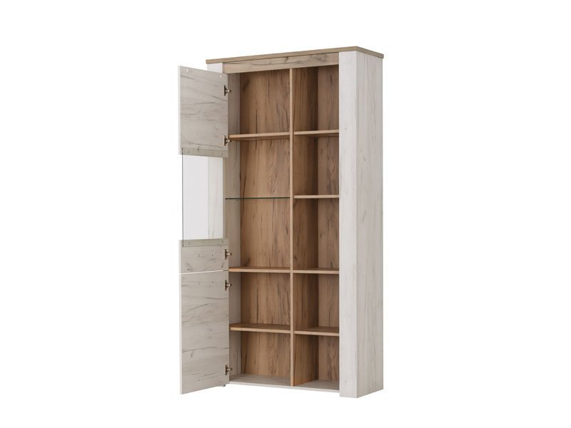 Vitrina KENT POP V, u belom i sivom hrast dezenu, poseduje upotrebni prostor sa sistemom polica u zatvorenom i otvorenom delu za omiljeni kućni dekor i drage stvari. Deo je istoimene kolekcije koja u vaš dom unosi dodir otmene klasike i rafiniranog ukusa. Ovaj model vitrine opciono možete osvežiti ugradnjom LED rasvete.   *Napomena: Cena bez rasvete – Mogućnost dodavanja rasvete. Preporučujemo Set LED rasvete Ra2