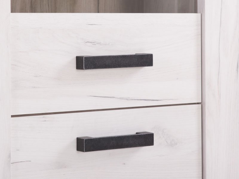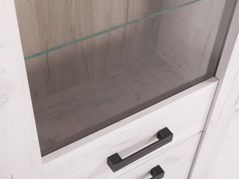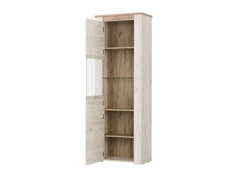 Vitrina KENT VS, u belom i sivom hrast dezenu, poseduje tri standardne i jednu staklenu policu, kao i poluzastakljeni deo pogodan za izlaganje omiljene dekoracije, knjiga i uspomena. Deo je istoimene kolekcije koja donosi dizajnerski iskorak u kreiranju enterijerskih rešenja za uređenje dnevnog boravka, spavaće sobe ili predsoblja. Ovaj model vitrine opciono možete osvežiti ugradnjom LED rasvete. *Napomena: Cena bez rasvete – Mogućnost dodavanja rasvete. Preporučujemo Set LED rasvete Ra2