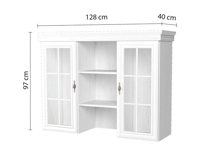 Tačan opis dezena je: korpus iverica Sosna Andersen, front iverica Sosna Andersen. Model vitrine KORA KN4, predstavlja gornji deo sa policama odgovarajuće kompozicije, sa dva zastakljena krila. Predstavljena je kao nadogradnja na veći broj komoda u istom dezenu iz kolekcije KORA.