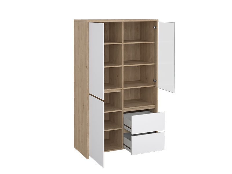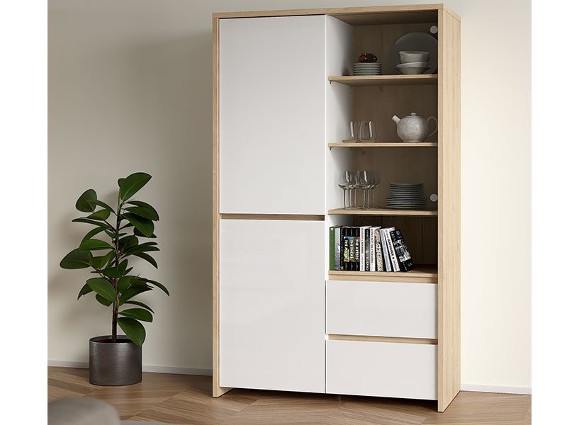 Tačan naziv dezena: korpus iverica jackson hickory, front iverica bela visoki sja. Vitrina NEXT 2V2F je funkcionalni dodatak za opremanje dnevnog boravka. Unosi kontrast u ambijent kombinacijom dekora. Deo je istoimenog sistema elemenata za uređenje ambijenta dnevnog boravka.