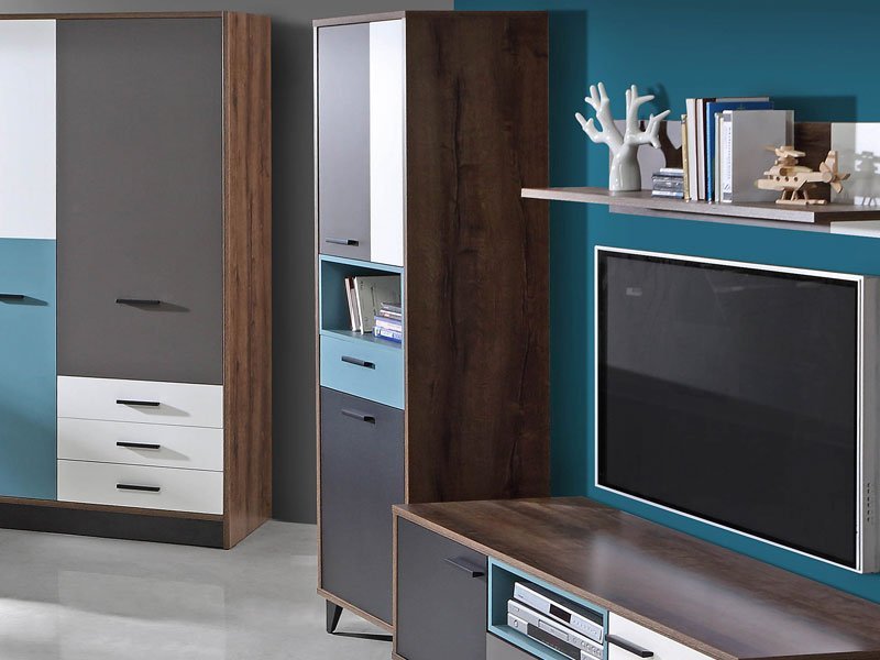 Tačan naziv dezena: korpus iverica Mud Oak, front iverica Uni Wolfram Grey /White/Black/Oriental green. Vitrina RAVEN 60 deo je istoimene kolekcije koja donosi dizajnerski iskorak u kreiranju enterijerskih rešenja za uređenje dnevnog boravka, spavaće sobe ili predsoblja.