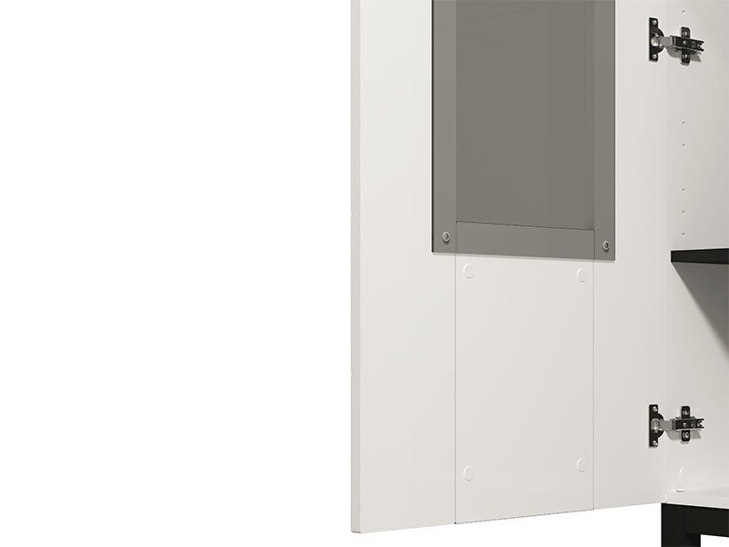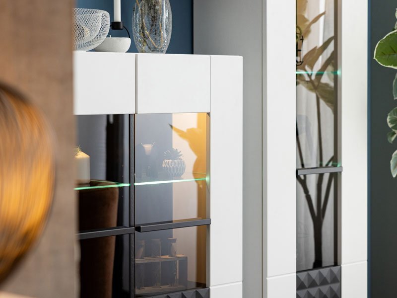 Vitrina SARTHE 1K VS1 je funkcionalni dodatak za opremanje dnevnog boravka. Odlikuje se dizajnom visokog stila, pre svega zahvaljujući kombinaciji atraktivnih dekora – opak bele, bele mat folije, crne i crne mat folije. Pravilno raspoređeni segmenti u kontrastnim dekorima daju jasnu definiciju enterijeru. Postoji mogućnost dodavanja rasvete. Deo je istoimenog sistema elemenata za uređenje ambijenta dnevnog boravka. *Napomena: cena je bez led rasvete. Preporučujemo Set spot svetla 1 SVETILJKA, Set led rasvete Ra