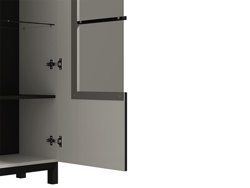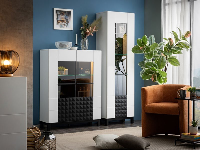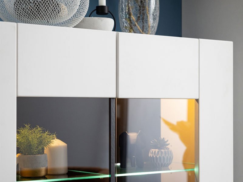 Vitrina SARTHE 2K VS2 je funkcionalni dodatak za opremanje dnevnog boravka. Odlikuje se dizajnom visokog stila, pre svega zahvaljujući kombinaciji atraktivnih dekora – opak bele, bele mat folije, crne i crne mat folije. Pravilno raspoređeni segmenti u kontrastnim dekorima daju jasnu definiciju enterijeru. Postoji mogućnost dodavanja rasvete. Deo je istoimenog sistema elemenata za uređenje ambijenta dnevnog boravka. *Napomena: cena je bez led rasvete. Preporučujemo Set spot svetla 2 SVETILJKE, Set LED rasvete Ra2