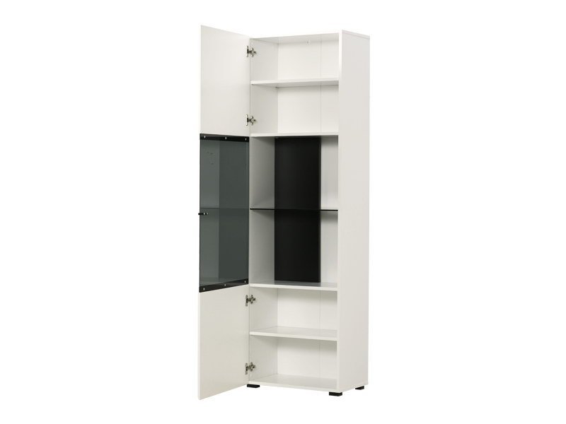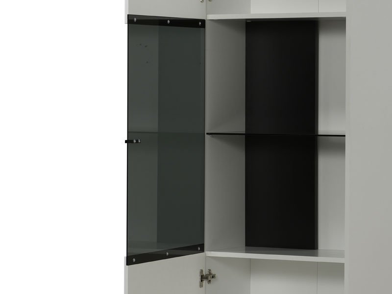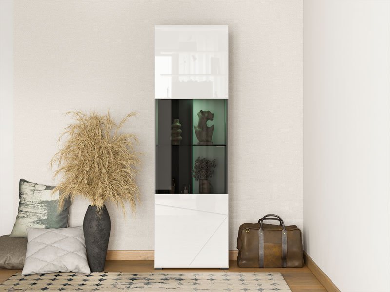 Vitrina TRENTINO 1K VS, u kombinaciji opak bele i crne sa frontovima presvučenim belom lak folijom sa 3D aplikacijama, deo je sistema elemenata TRENTINO čiji dizajn i funkcionalnost doprinose praktičnim i estetski autentičnim rešenjima za opremanje enterijera. Sačinjena je od jednog zatvorenog dela sa unutrašnjim pregredama, koje se u središnjem delu vitrine naziru kroz tamno parsol staklo, gde takođe postoji mogućnost ugradnje LED rasvete. *Napomena: Cena bez rasvete – Mogućnost dodavanja rasvete. Preporučujemo Set LED rasvete Ra13
