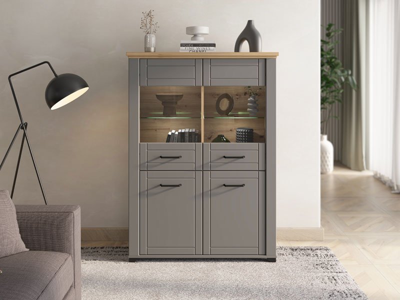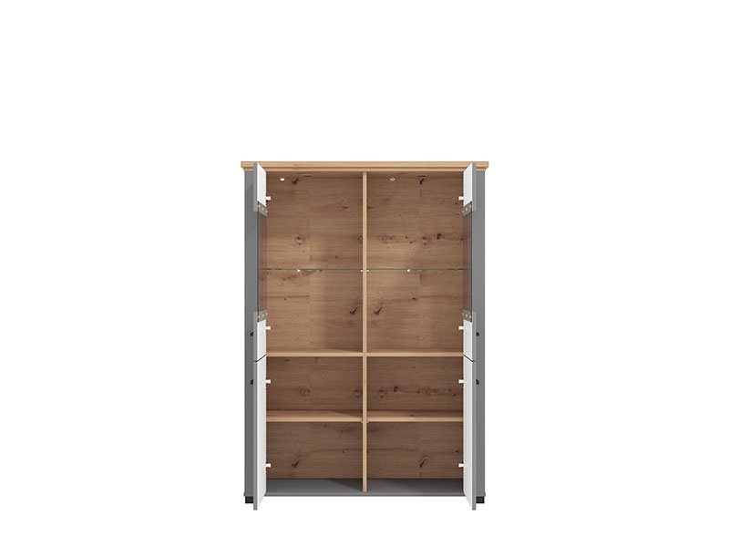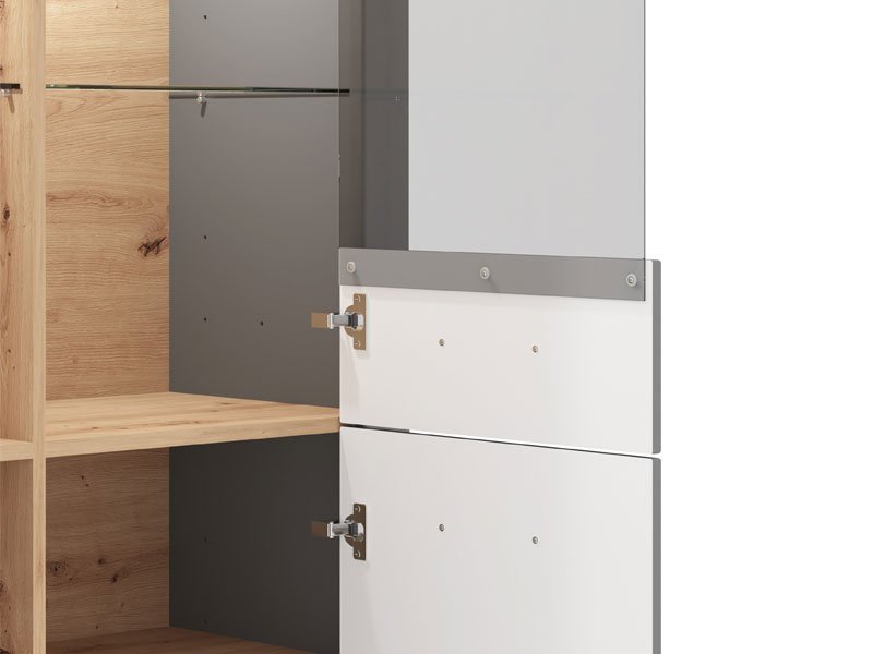 Vitrina VALENCIA 2K VS2 u kombinaciji dekora artisan hrast, grafit sive i sive mat folije unosi u prostor suptilniju, monohromatsku notu. Upotrebni prostor čine dva zatvorena i dva zastakljena dela, koji u unutrašnjosti poseduje praktično raspoređene police za odlaganje. Frontovi su obogaćeni crnim ručicama jednostavnog dizajna, a koje su usklađene sa dizajnerskom linijom cele kolekcije. Pripada istoimenom sistemu elemenata VALENCIA, koji odlikuje funkcionalnost i praktičnost kojoj doprinosi, kako veliki broj elemenata u sistemu, tako i odlična organizacija prostora za odlaganje. Vitrina VALENCIA 2K VS2 poseduje mogućnost dodavanja LED rasvete.