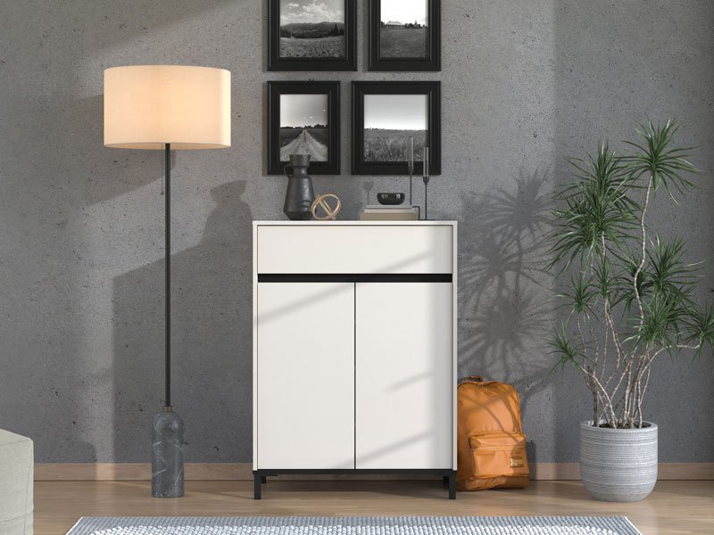 Cipelar FLANNAN 2K1F2VF, u kašmir dekoru i detaljima izrađenim od crne mat folije, je moderno i funkcionalno rešenje za odlaganje obuće, koje se može uklopiti i u predsoblja manjih površina, a odgovaraće svakom stilu uređenja doma. Ono što izdvaja ovaj model predsoblja je njegova funkcionalnost. Poseduje praktičan zatvoren deo za odlaganje obuće koji se sastoji od dva krila sa policama, kao i jednu prostranu fioku.