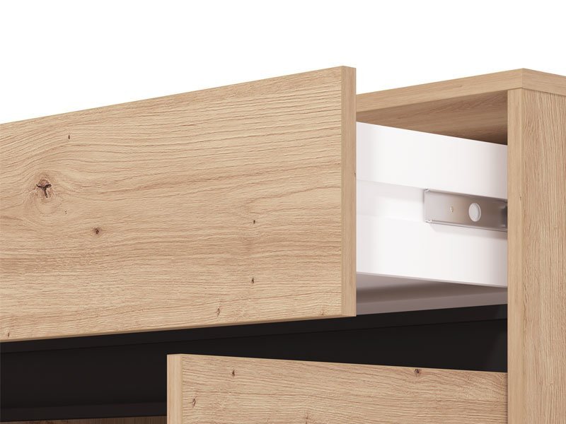 Cipelar FLANNAN 2K1F2VF, u artisan hrast dekoru i detaljima izrađenim od crne mat folije, je moderno i funkcionalno rešenje za odlaganje obuće, koje se može uklopiti i u predsoblja manjih površina, a odgovaraće svakom stilu uređenja doma. Ono što izdvaja ovaj model predsoblja je njegova funkcionalnost. Poseduje praktičan zatvoren deo za odlaganje obuće koji se sastoji od dva krila sa policama, kao i jednu prostranu fioku.