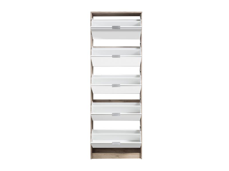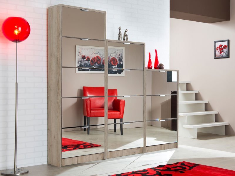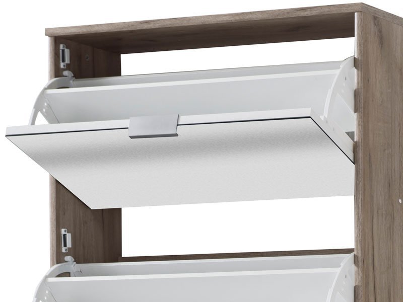 Cipelar HUGO 25 OG, u kombinaciji ogledala i korpusa u dekoru sivog hrasta, poseduje pet segmenata za odlaganje sezonske obuće, a zahvaljujući svojim dimenzijama i dvorednoj organizaciji, predstavlja veoma efektno funkcionalno rešenje za uređenje predsoblja skromnijih dimenzija.