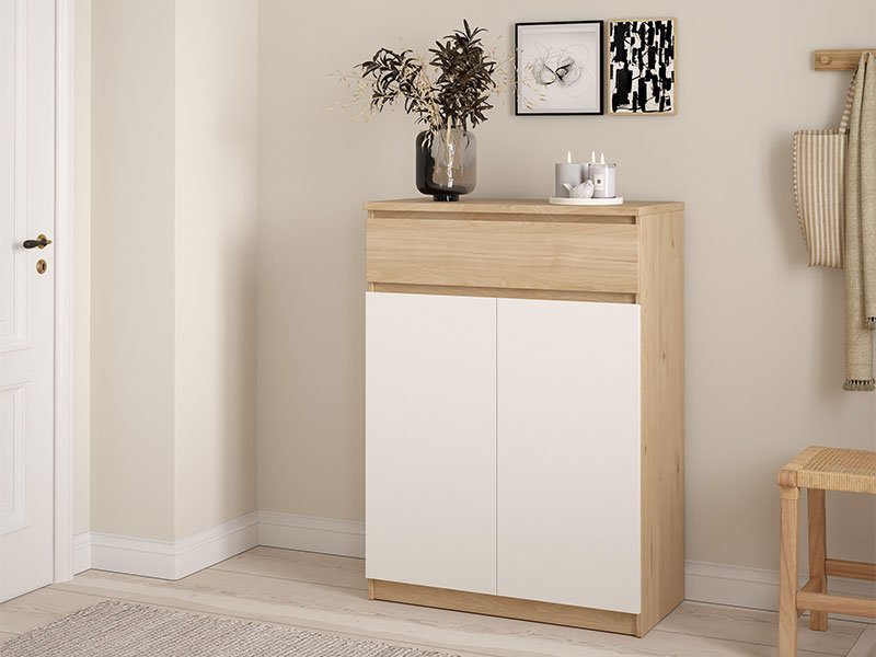 Tačan naziv dezena: korpus iverica sonoma, front iverica sonoma/bela. Cipelar NAIA 80 idealno je rešenje za uklapanje u prostore različitih dimenzija. Ovaj model poseduje fioku i deo sa pet praktičnih polica.
