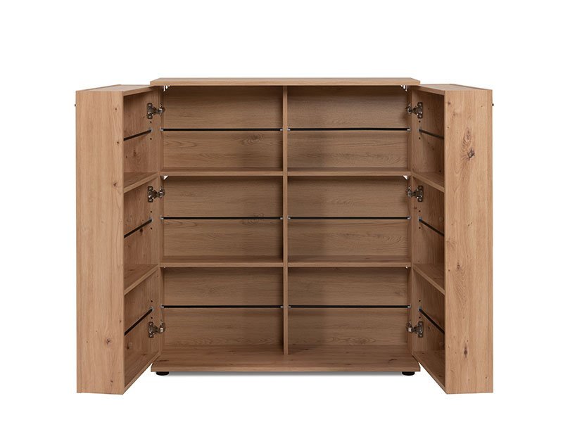 Tačan naziv dezena: korpus/front iverica artisan. Cipelar SANTOS 2V je moderno i funkcionalno rešenje za odlaganje obuće, koje se može uklopiti i u predsoblja manjih površina a odgovaraće svakom stilu uređenja doma. Ono što izdvaja ovaj model predsoblja je njegova funkcionalnost, jer je dizajniran tako da se obuća može odlagati i u standardnom pregradnom delu, ali i u vratima koja imaju dubinu, tako da i ona čine pregradni deo za odlaganje.