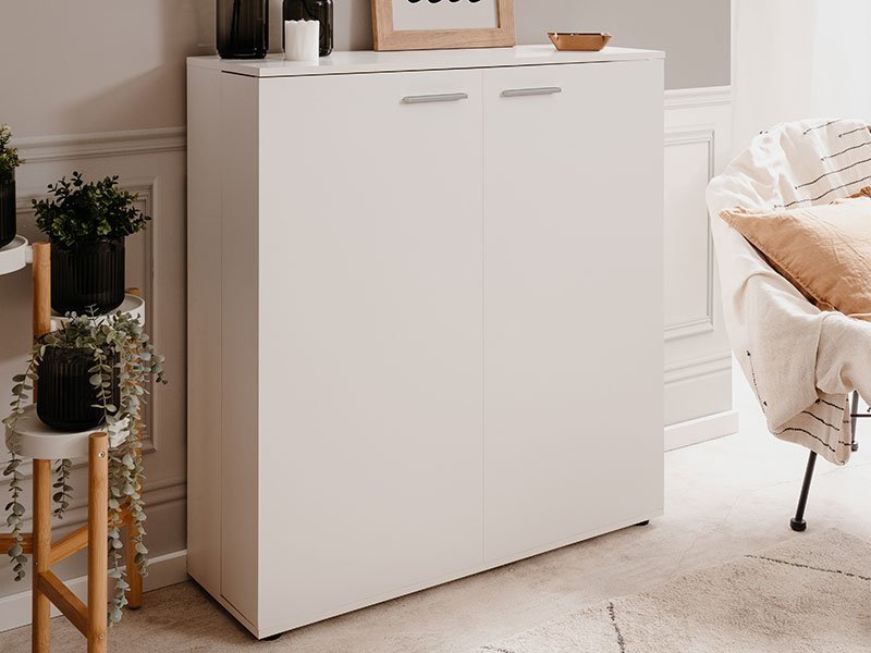 Tačan naziv dezena: korpus/front iverica bela. Cipelar SANTOS 2V je moderno i funkcionalno rešenje za odlaganje obuće, koje se može uklopiti i u predsoblja manjih površina a odgovaraće svakom stilu uređenja doma. Ono što izdvaja ovaj model predsoblja je njegova funkcionalnost, jer je dizajniran tako da se obuća može odlagati i u standardnom pregradnom delu, ali i u vratima koja imaju dubinu, tako da i ona čine pregradni deo za odlaganje.