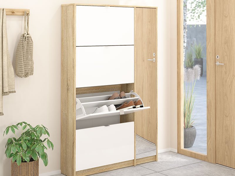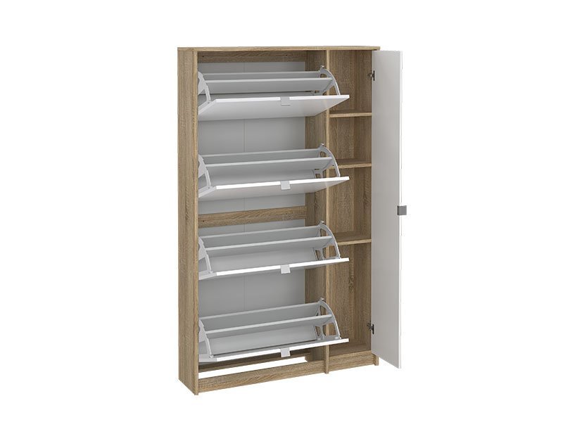 Tačan naziv dezena: korpus iverica natur, front iverica bela visoki sjaj ogledalo. U unutrašnjosti cipelara SHOES 4V1O nalaze se zatvorene police za odlaganje obuće, koje pružaju mogućnost racionalne organizacije predsoblja kao i ogledalo sa pregradnim policama.
