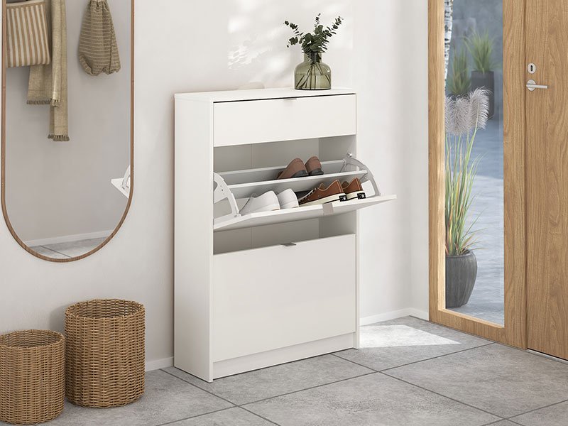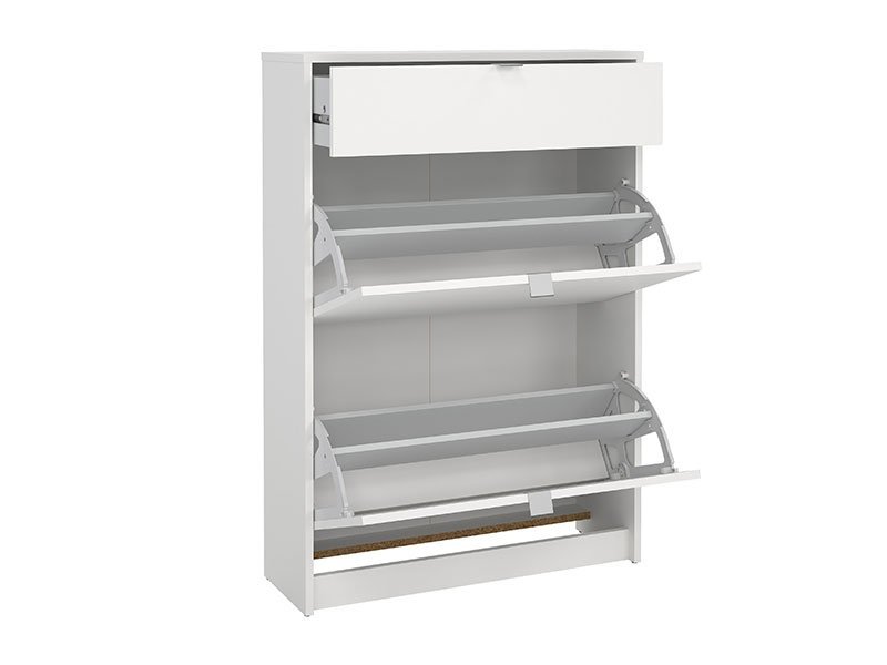 Tačan naziv dezena: korputs/front iverica bela. U unutrašnjosti cipelara SHOES V nalazi se fioka, kao i zatvorene police za odlaganje obuće, što omogućava racionalnu organizaciju predsoblja.