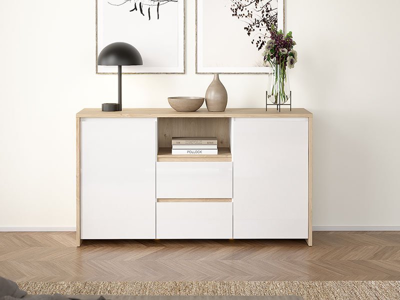 Tačan naziv dezena: korpus iverica jackson hickory, front iverica bela visoki sjaj. Komoda NEXT 2V2F je funkcionalni dodatak za opremanje dnevnog boravka. Kombinacija dekora unosi svežinu i koloritnu ujednačenost u ambijent. Deo je istoimenog sistema elemenata za uređenje ambijenta dnevnog boravka.