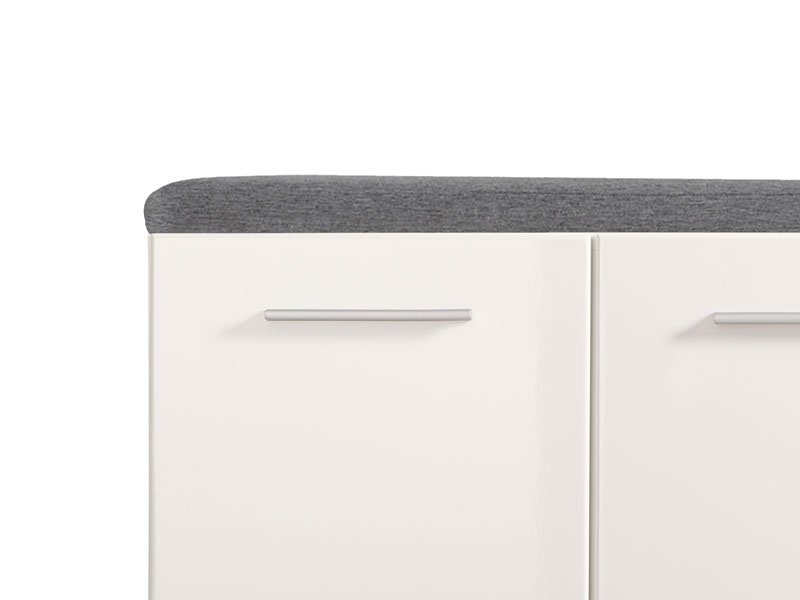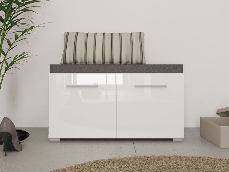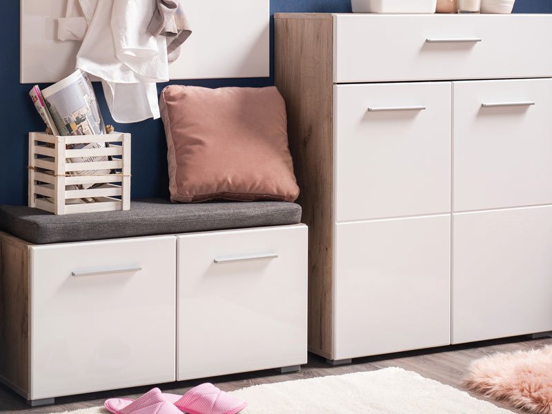Element predsoblja BENY KOM, u sivom hrast dezenu sa belom lak folijom, poseduje praktičan zatvoren deo za odlaganje obuće, kao i tapaciranu površinu. Može se kombinovati sa istoimenim elementima koji zaokružuju enterijersku priču ulaza u vaš dom.