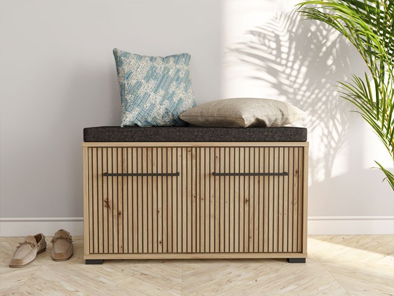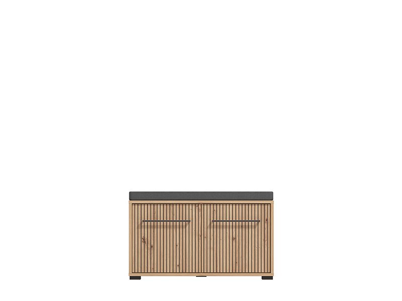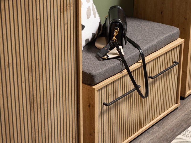 Element predsoblja LANDES KOM, u kombinaciji dekora artisan hrasta i artisan hrasta sa prugama, poseduje praktičan dvodelni zatvoren deo za odlaganje obuće i jastuk za sedeći deo u sivom dezenu. Može se kombinovati sa drugim elementima kolekcije za predsoblje LANDES, koji zaokružuju enterijersku priču ulaza u vaš dom.