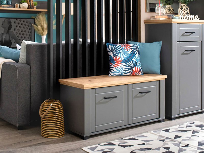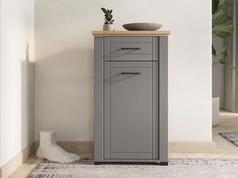 Element predsoblja VALENCIA 1K1F u kombinaciji artisan hrasta, grafit sive i sive mat folije unosi u prostor suptilniju, monohromatsku notu, koja dolazi kroz pravilne dizajnerske linije. Frontovi su obogaćeni crnim ručicama jednostavnog dizajna, a koje su usklađene sa dizajnerskom linijom cele kolekcije. Upotrebni prostor se sastoji od fioke i praktičnog zatvorenog segmenta za odlaganje obuće. Deo je istoimenog sistema elemenata za opremanje ambijenta predsobolja, koji odlikuju funkcionalnost i praktičnost kojoj doprinosi kako veliki broj elemenata u sistemu, tako i odlična organizacija prostora za odlaganje.