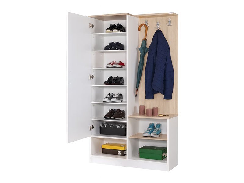 Tačan naziv dezena: korpus iverica bela/sonoma ogledalo, front iverica bela .Predsoblje ELENA učiniće da prvi suret sa enterijerom svakog doma bude efektan i prijatan. Upotrebni prostor čine zatvoreni i otvoreni deo za odlaganje obuće, tako da ćete postići funkcionalno organizovan prostor.