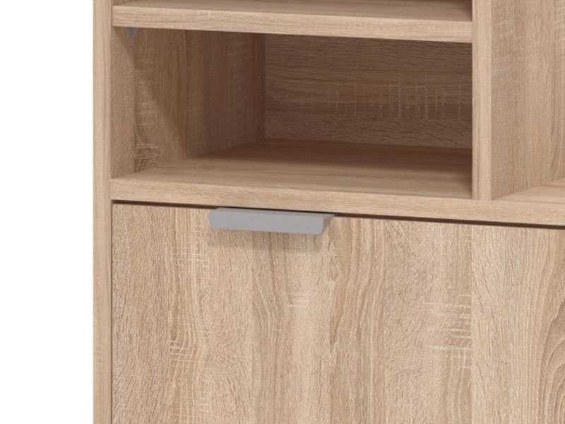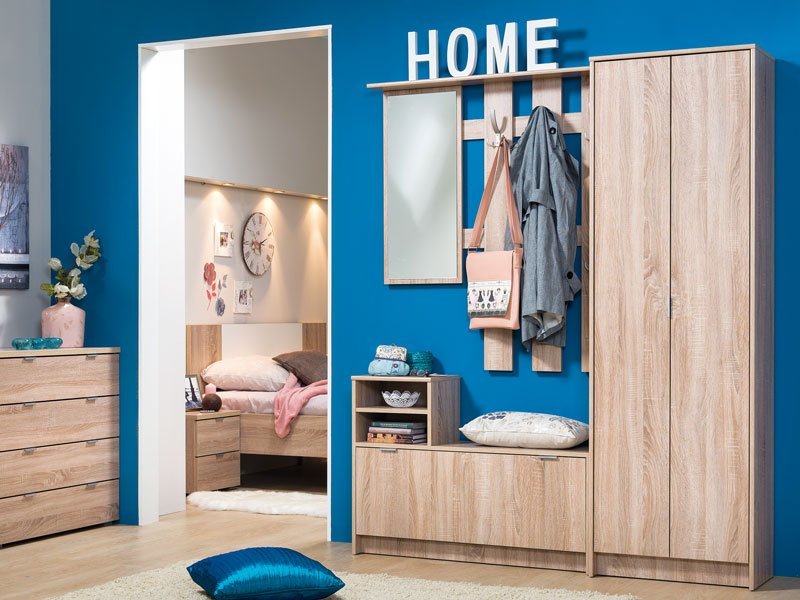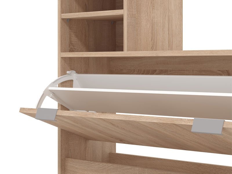 Predsoblje RAVENNA, u sonoma hrast dezenu, sastoji se iz dva praktična dela koja će vam pomoći da svoju omiljenu obuću i odeću adekvatno odložite. Gornji deo koji se kači na zid sadrži zakačke i ogledalo, dok je donji sa dve otvore police i zatvorenim segmentom za odlaganje obuće.
