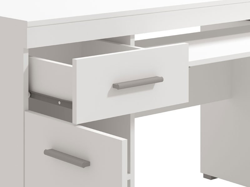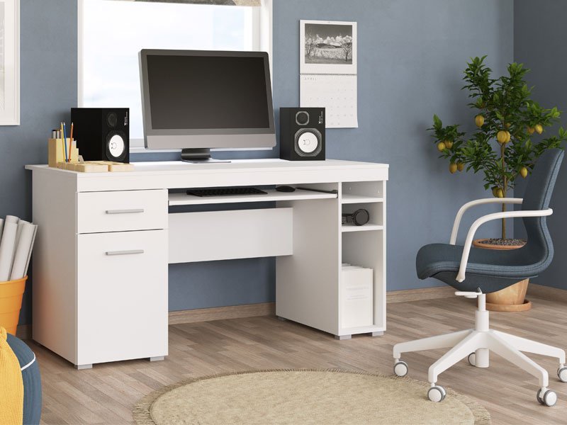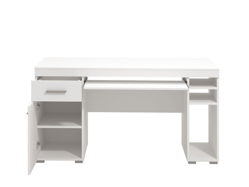Ozbiljan sto za ozbiljne projekte – sa policom za tastaturu koja se izvlači i fiokom i zatvorenom policom za maksimalnu iskorišćenost prostora za odlaganje. Sa druge strane se nalaze otvorene police za odlaganje diskova i kućišta kompjutera. Kompjuter sto ALFA, u opak belom dezenu, biće idealan gost svake radne sobe.